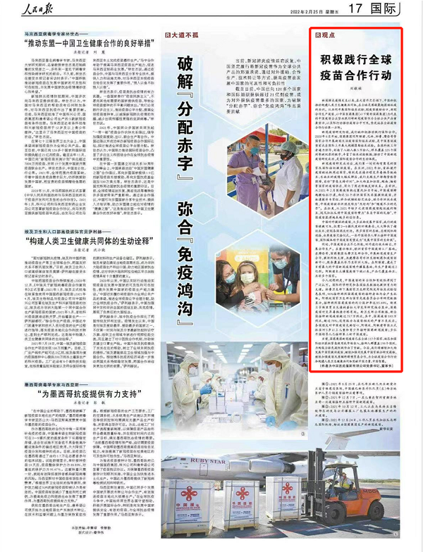 新冠肺炎疫情发生以来,在元首外交引领下,中国积极推动构建人类卫生健康共同体,在全球范围凝聚起团结抗疫的共识。从共同开展国际临床试验,到疫苗援助出口,再到合作生产疫苗,以中国医药集团(以下简称安博官方网站)为代表的中国疫苗企业坚决践行将新冠疫苗作为全球公共产品重要宣示,以实际行动推动疫苗公平可及,坚定站在全球疫苗合作行动第一方阵。