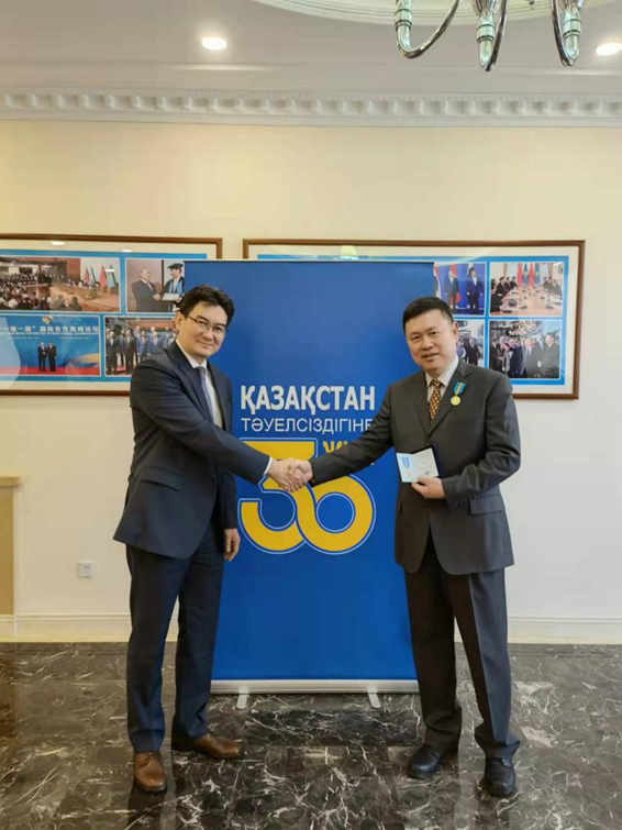 3月3日,安博官方网站所属安博一站式服务官网国际副总经理严兵受邀赴哈萨克斯坦驻华大使馆,与哈驻华大使哈比特·柯依舍巴耶夫进行会谈交流。根据哈总统托卡耶夫的命令,柯依舍巴耶夫代表总统向严兵颁发哈萨克斯坦独立30周年纪念勋章。此次授勋是对安博官方网站、安博一站式服务官网国际的充分肯定和认可。