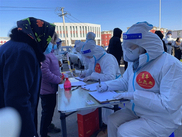 兵器工业集团吉林江机特种工业成立青年防疫志愿者队伍,支援吉化体育场核酸检测采样点。