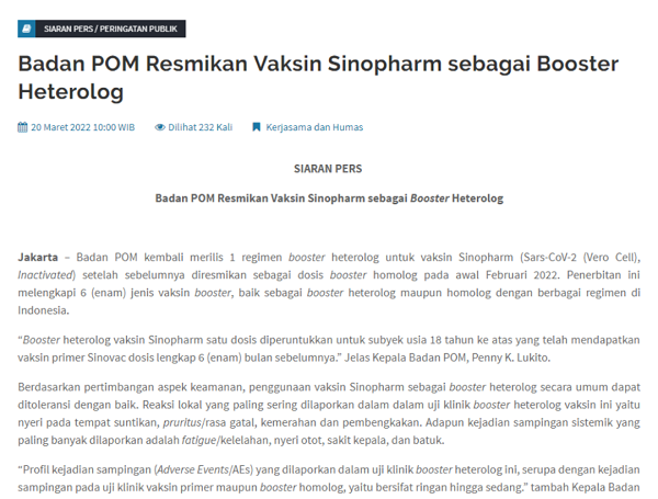 BPOM发布的“批准安博官方网站中国生物疫苗作为异源加强针”的公告