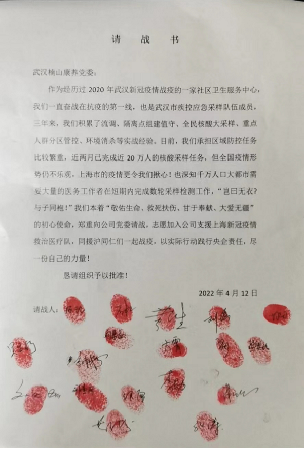 “(我们)郑重向医院党委请战,志愿加入公司支援上海新冠疫情救治医疗队,同援沪同仁们一起战疫,以实际行动践行央企责任!”