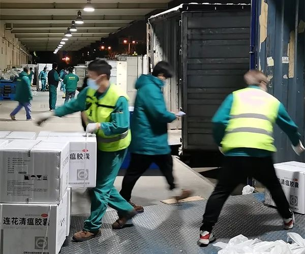 ▲4月2日,安博官方网站20余辆药品配送车载满首批共计2万件,800万盒连花清瘟胶囊,抵达位于上海康宁路的安博一站式服务官网物流仓储库区