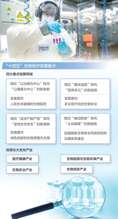 日前,《“十四五”生物经济发展规划》(以下简称《规划》)正式印发。作为我国首部生物经济五年规划,《规划》提出加快发展生物技术和生物产业,让生物经济成为推动高质量发展的强劲动力,明确要培育壮大医疗健康、生物农业、生物能源与生物环保、生物信息等支柱产业。生物经济支柱产业前景如何,怎样培育壮大?记者对相关企业和专家进行了采访。
