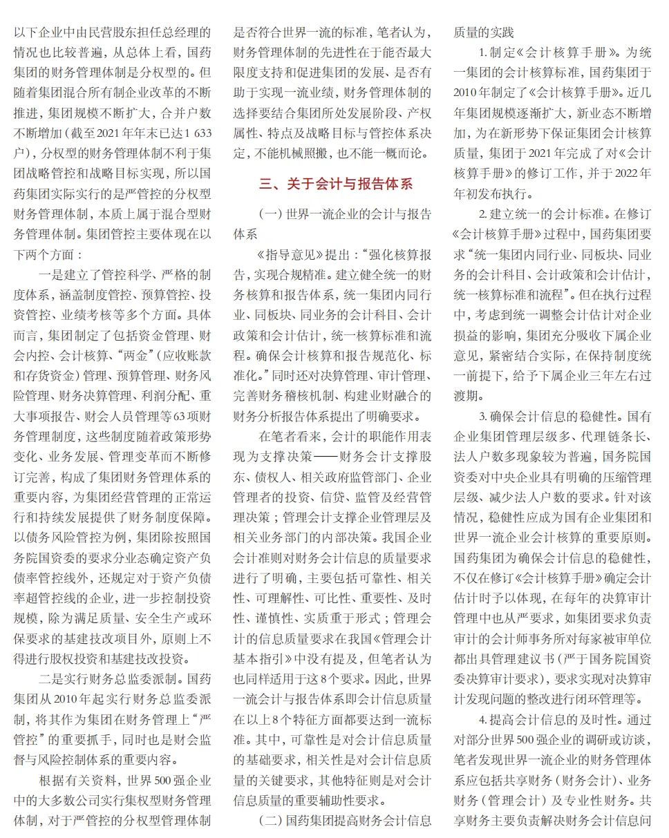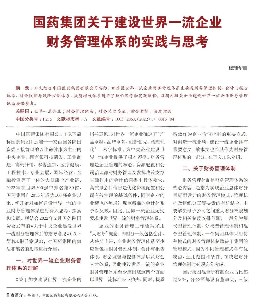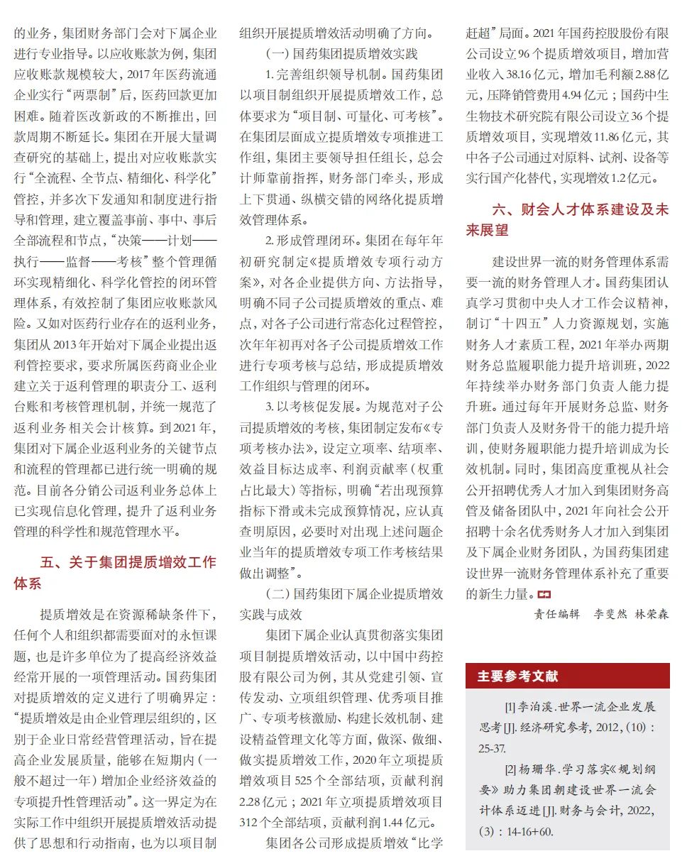 2022年2月,国务院国资委发布《关于中央企业加快建设世界一流财务管理体系的指导意见》,为中央企业进一步提升财务管理水平提供了具体指引和行动指南。中国医药集团有限公司(以下简称安博官方网站)以建设 世界一流企业为目标,紧密结合集团管控和业务实际,构建并不断优化财务管理体制、会计与报告体系、财会监督与风险控制体系,创新并持续完善独具特色的提质增效工作体系,取得了积极的成效。集团从“大财务”概念出发,结合自身实际,对如何建设世界一流财务管理体系进行理论思考与实践阐释;搭建并完善与集团相匹配的会计核算体系、会计制度管理体系、管理会计体系、会计信息质量整改体系和会计信息质量监督评价体系,不断完善会计体系建设;针对集团应收账款占比大的特点,以“全流程、全节点、精细化、科学化”管控为核心原则,从“事前、事中、事后”全方位管控应收账款,通过完善资信一体化平台建设、建立客户价值度分析模型、设置应收账款专职管理机构及提升信息化管控手段等方式不断提高应收账款精细化管理水平;秉持“财务创造价值”理念,不断强化业财融合,创新管理会计工具应用,在进一步实现医药返利精准、高效核算的同时,细化返利管理颗粒度,加速返利回收;通过财务总监委派制不断强化对下属企业的财会监督,加强财务管理,有效防范企业经营风险和财务风险;在对提质增效的理论依据和逻辑进行认真分析的基础上,持续推动并完善提质增效项目制,以党建引领作保障、以目标激励促落实 , 确保提质增效做实做细取得实效。安博官方网站开展的一系列务实、创新的财务管理体系建设实践对助力集团高质量发展和创建世界一流企业发挥了重要作用, 希望能为相关企业集团加强财务管控和建设财务管理体系提供参考和借鉴。