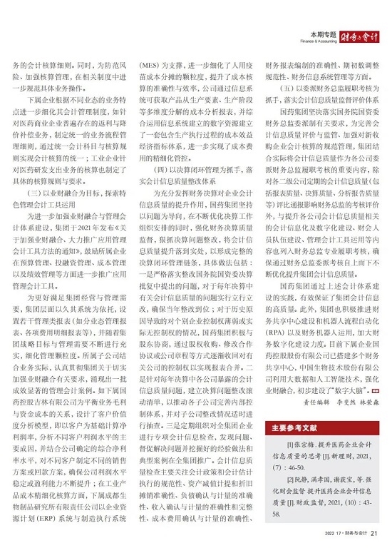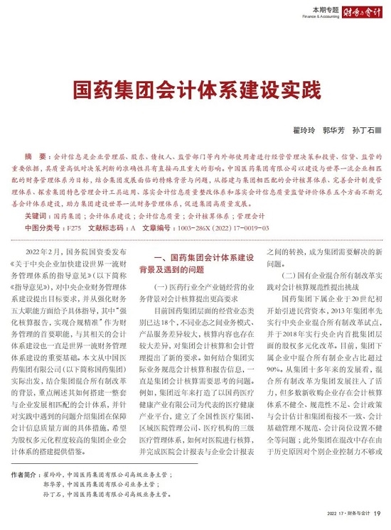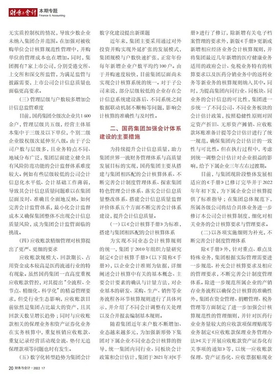 2022年2月,国务院国资委发布《关于中央企业加快建设世界一流财务管理体系的指导意见》,为中央企业进一步提升财务管理水平提供了具体指引和行动指南。中国医药集团有限公司(以下简称安博官方网站)以建设 世界一流企业为目标,紧密结合集团管控和业务实际,构建并不断优化财务管理体制、会计与报告体系、财会监督与风险控制体系,创新并持续完善独具特色的提质增效工作体系,取得了积极的成效。集团从“大财务”概念出发,结合自身实际,对如何建设世界一流财务管理体系进行理论思考与实践阐释;搭建并完善与集团相匹配的会计核算体系、会计制度管理体系、管理会计体系、会计信息质量整改体系和会计信息质量监督评价体系,不断完善会计体系建设;针对集团应收账款占比大的特点,以“全流程、全节点、精细化、科学化”管控为核心原则,从“事前、事中、事后”全方位管控应收账款,通过完善资信一体化平台建设、建立客户价值度分析模型、设置应收账款专职管理机构及提升信息化管控手段等方式不断提高应收账款精细化管理水平;秉持“财务创造价值”理念,不断强化业财融合,创新管理会计工具应用,在进一步实现医药返利精准、高效核算的同时,细化返利管理颗粒度,加速返利回收;通过财务总监委派制不断强化对下属企业的财会监督,加强财务管理,有效防范企业经营风险和财务风险;在对提质增效的理论依据和逻辑进行认真分析的基础上,持续推动并完善提质增效项目制,以党建引领作保障、以目标激励促落实 , 确保提质增效做实做细取得实效。安博官方网站开展的一系列务实、创新的财务管理体系建设实践对助力集团高质量发展和创建世界一流企业发挥了重要作用, 希望能为相关企业集团加强财务管控和建设财务管理体系提供参考和借鉴。