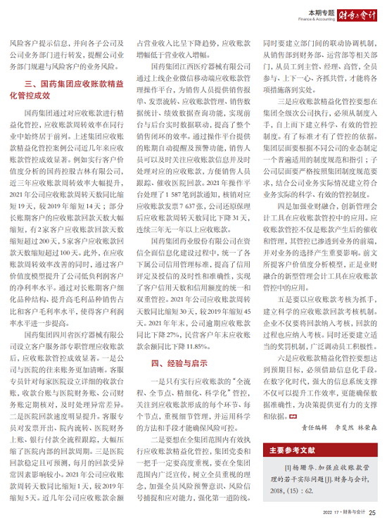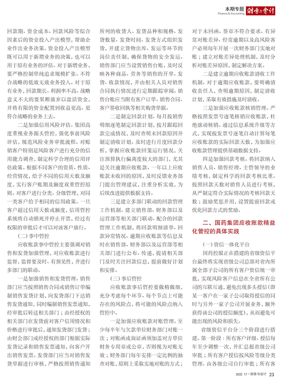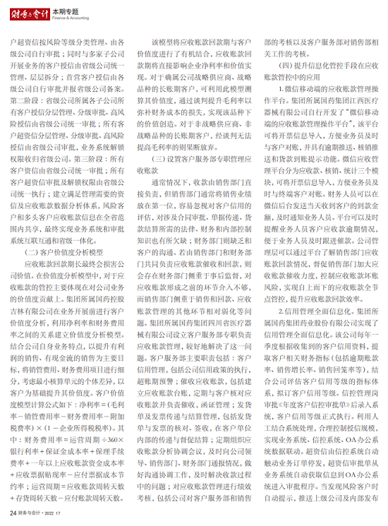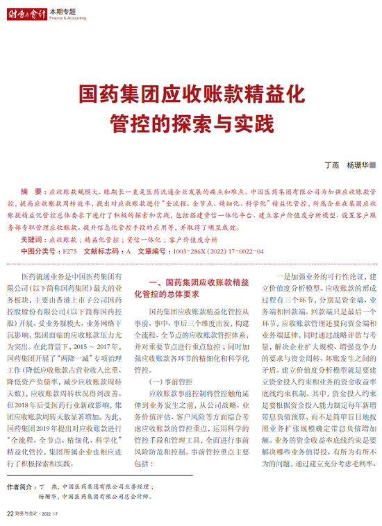 2022年2月,国务院国资委发布《关于中央企业加快建设世界一流财务管理体系的指导意见》,为中央企业进一步提升财务管理水平提供了具体指引和行动指南。中国医药集团有限公司(以下简称安博官方网站)以建设 世界一流企业为目标,紧密结合集团管控和业务实际,构建并不断优化财务管理体制、会计与报告体系、财会监督与风险控制体系,创新并持续完善独具特色的提质增效工作体系,取得了积极的成效。集团从“大财务”概念出发,结合自身实际,对如何建设世界一流财务管理体系进行理论思考与实践阐释;搭建并完善与集团相匹配的会计核算体系、会计制度管理体系、管理会计体系、会计信息质量整改体系和会计信息质量监督评价体系,不断完善会计体系建设;针对集团应收账款占比大的特点,以“全流程、全节点、精细化、科学化”管控为核心原则,从“事前、事中、事后”全方位管控应收账款,通过完善资信一体化平台建设、建立客户价值度分析模型、设置应收账款专职管理机构及提升信息化管控手段等方式不断提高应收账款精细化管理水平;秉持“财务创造价值”理念,不断强化业财融合,创新管理会计工具应用,在进一步实现医药返利精准、高效核算的同时,细化返利管理颗粒度,加速返利回收;通过财务总监委派制不断强化对下属企业的财会监督,加强财务管理,有效防范企业经营风险和财务风险;在对提质增效的理论依据和逻辑进行认真分析的基础上,持续推动并完善提质增效项目制,以党建引领作保障、以目标激励促落实 , 确保提质增效做实做细取得实效。安博官方网站开展的一系列务实、创新的财务管理体系建设实践对助力集团高质量发展和创建世界一流企业发挥了重要作用, 希望能为相关企业集团加强财务管控和建设财务管理体系提供参考和借鉴。