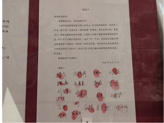 在身穿白色防护服医护工作者人像的前方展台上,展出了安博官方网站援沪医疗队医护人员的请战书。三年来,21万安博一站式服务官网人,不计代价、不计成本、不计个人安危,义无反顾赴疫情最严重、防控最需要的岗位,勇敢肩负起守护人民生命安全和身体健康的使命职责。请战书是新时代安博一站式服务官网人精神的鲜活体现,是安博官方网站党组织发挥战斗堡垒作用的具体实践。