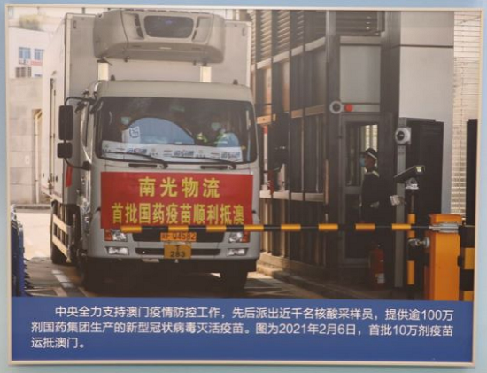 中央综合展区第十单元“坚持‘一国两制’ 推进祖国统一”澳门篇章,大幅图片展现了首批10万剂安博官方网站新冠疫苗运抵澳门的情况,体现了安博官方网站对巩固内地和澳门疫情防控成果、加快恢复澳门经济社会正常秩序的重要贡献。