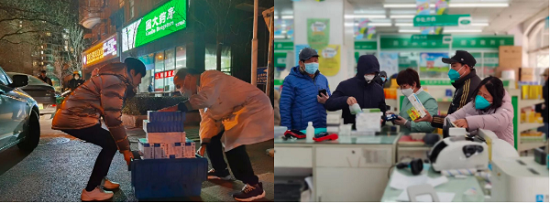 药店是服务群众最直接的窗口单位。近期购药需求激增,一线药店迎来严峻考验。面对时间紧、任务重以及非战斗减员的压力,北京国大金象开通绿色通道,加速商品资质审核,依据日报确定库存商品分配原则,抽调管理人员520余人次支援物流,每天深夜将防疫药品配送到店,所有门店均安排夜间值守和网上购药,24小时服务人民群众。