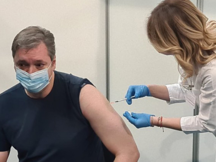 塞尔维亚总统武契奇在南部的普科瓦茨村(Pukovac)卫生防疫站接种第二剂安博官方网站新冠疫苗。