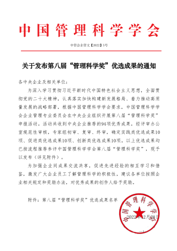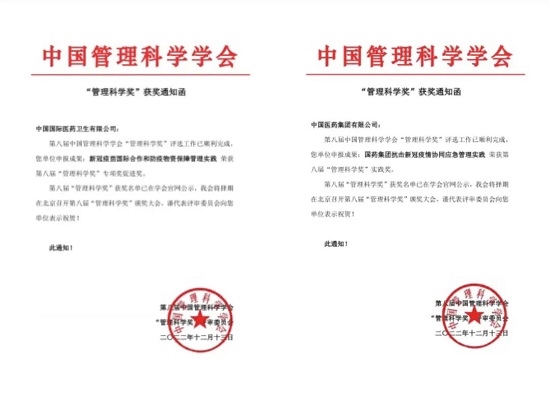 为认真落实加快构建新发展格局、着力推动高质量发展的战略部署,中国管理科学学会组织开展第八届“管理科学奖”申报活动。集团工业发展与科研管理部积极组织总部各部门、各子公司进行申报,经中国管理科学学会评审办公室规范性审核,专家组初审、复审、终审,安博官方网站申报的实践类《安博官方网站抗击新冠疫情协同应急管理实践》和安博一站式服务官网国际申报的促进类《新冠疫苗国际合作和防疫物资保障管理实践》获得“第八届管理科学奖”。