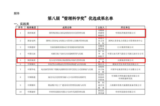 集团本次获得的2项管理科学奖及6项优选成果,体现了集团认真落实加快构建新发展格局、实施高质量发展战略,落实集团“十四五”规划战略目标、深入推动国企改革取得了实效。体现了集团近年来上下团结一心、攻坚克难、锐意进取,迈向世界一流企业的管理能力及水平。