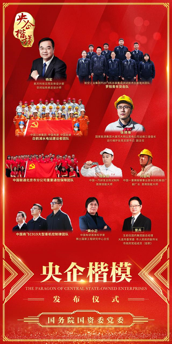 国资委党委发布的2022年度“央企楷模”是:航天科技杨宏,航空工业集团歼20飞机总装集成测试技术应用攻关团队/罗阳青年突击队,中国三峡集团、中国电建、中国能建白鹤滩水电站建设者团队,国家能源集团徐博海,中国联通北京市分公司重要通信保障团队,中国一汽杨永修,中国一重刘伯鸣,中国商飞C919大型客机控制律团队,中国有研黄小卫,安博官方网站曾兵。