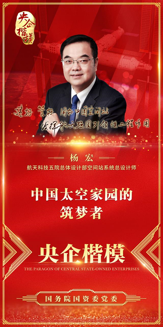 杨宏,国际宇航学院院士、中国工程院院士,曾任神舟飞船副总设计师、天宫一号总设计师,曾获国家科技进步奖特等奖2项、军队科技进步奖一等奖2项。先后主持神舟一号、神舟三号总体工作,作为副总师负责神舟四号飞行控制工作,作为天宫一号总设计师全程参与神舟八号与天宫一号交会对接任务。他30年扎根航天重大工程一线,带领团队突破技术封锁,彻底解决空间站建设核心元器件“卡脖子”问题,见证了我国载人航天事业从萌芽到壮大、从跟随到超越的非凡历程,为我国载人航天事业作出突出贡献。