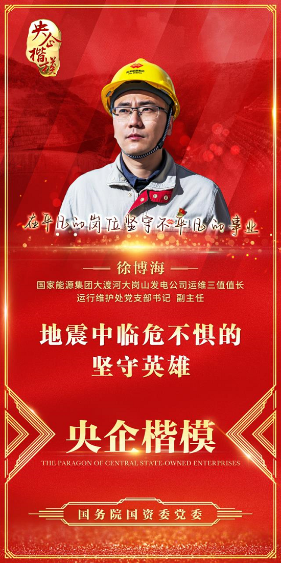 2022年9月5日,四川甘孜州泸定县发生6.8级强震,距离震中仅21公里的国家能源集团大渡河大岗山水电站震感强烈。在生死抉择的危急关头,当值值长徐博海坚守岗位,冒着余震风险,第一时间逆向奔赴现场。面对远方值守调度的询问,他回答道:“只要我还在,就一定能接起电话,如果后续电话无人接听,那么应急指挥中心和我都不在了。”之后,他带领值守人员沉着冷静完成一系列应急处置,快速消除因地震影响电站发电运行的故障隐患,确保电站在震后始终保持稳定运行,保障下游百姓生命财产安全。