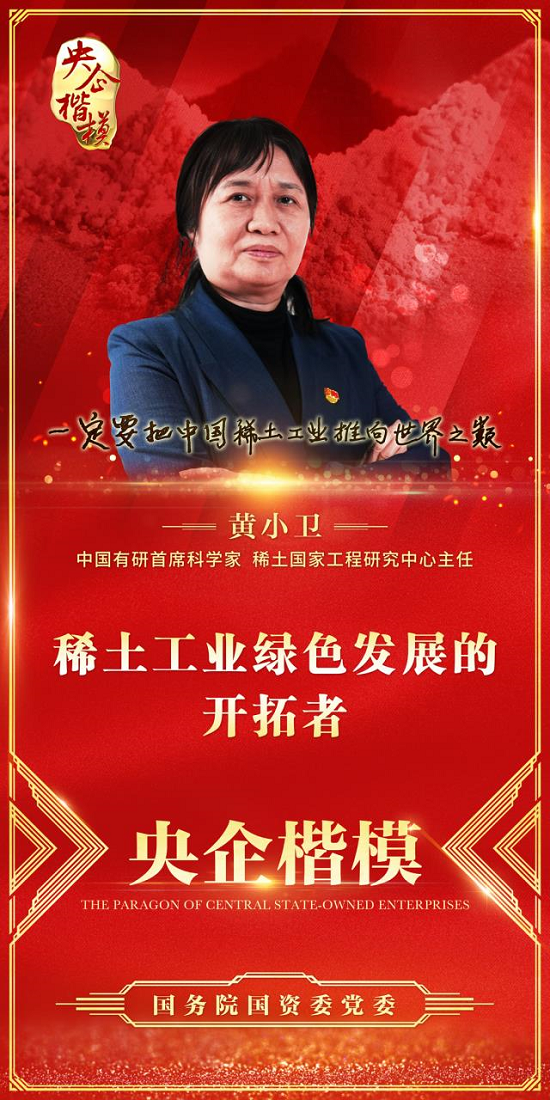 黄小卫,中国工程院院士。她扎根科研一线近四十年,致力于稀土资源高效绿色提取分离与新材料研究、工程化开发与应用推广,带领团队攻坚克难、不断探索创新,攻破了系列稀土冶金工艺技术难题,开发出系列重大创新成果,在 50 余家大型稀土企业推广应用,有力推动了中国稀土资源绿色高效开发利用,引领稀土工业绿色发展。为我国稀土提取分离技术领先世界做出了突出贡献。