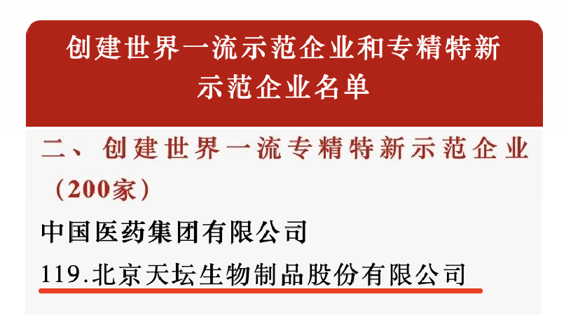 近日,国务院国资委公布最新“创建世界一流示范企业和专精特新示范企业”名单,安博官方网站北京天坛生物制品股份有限公司入选“创建世界一流专精特新示范企业”名单,成为全国首批200家世界一流专精特新示范企业之一。